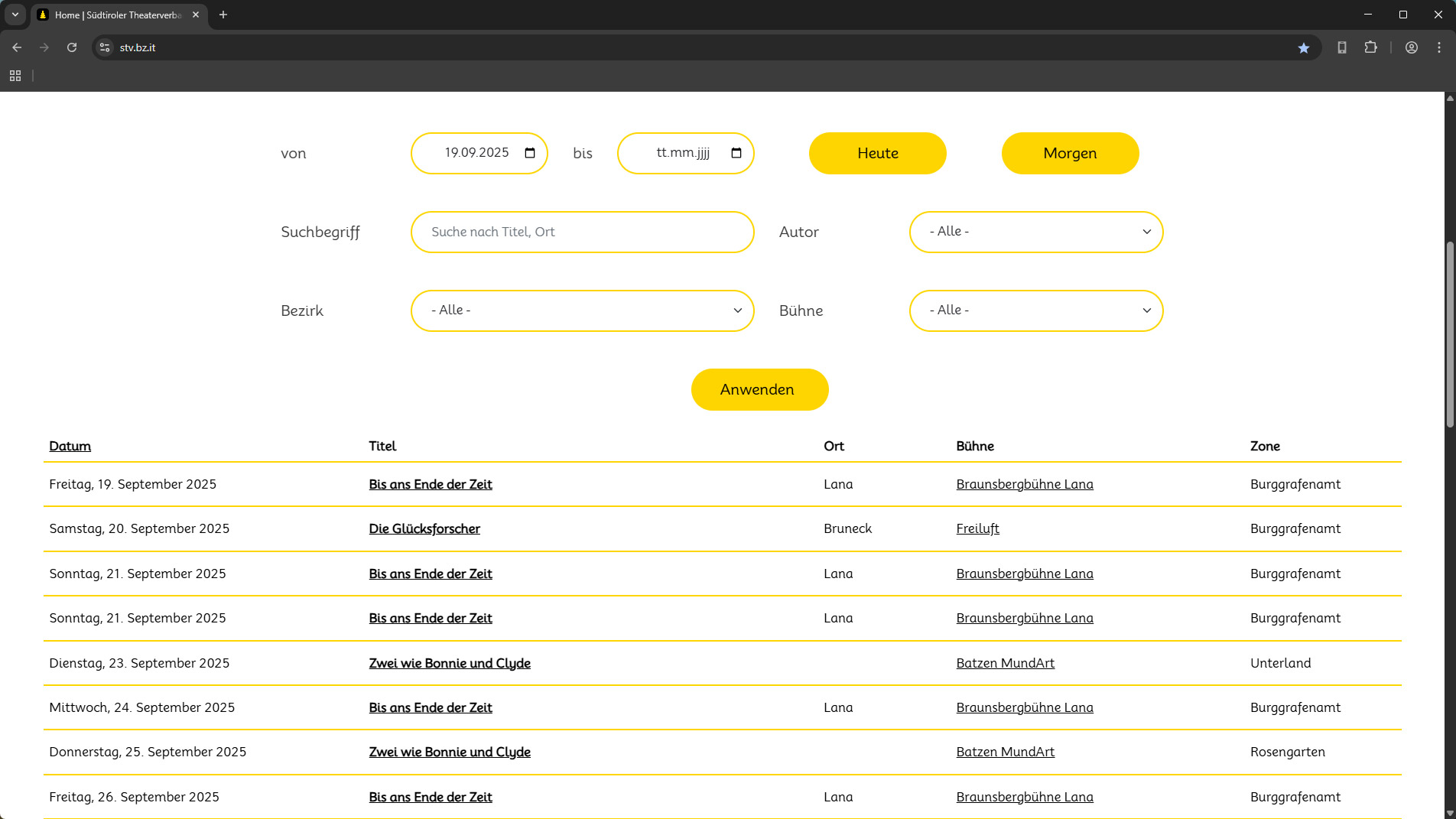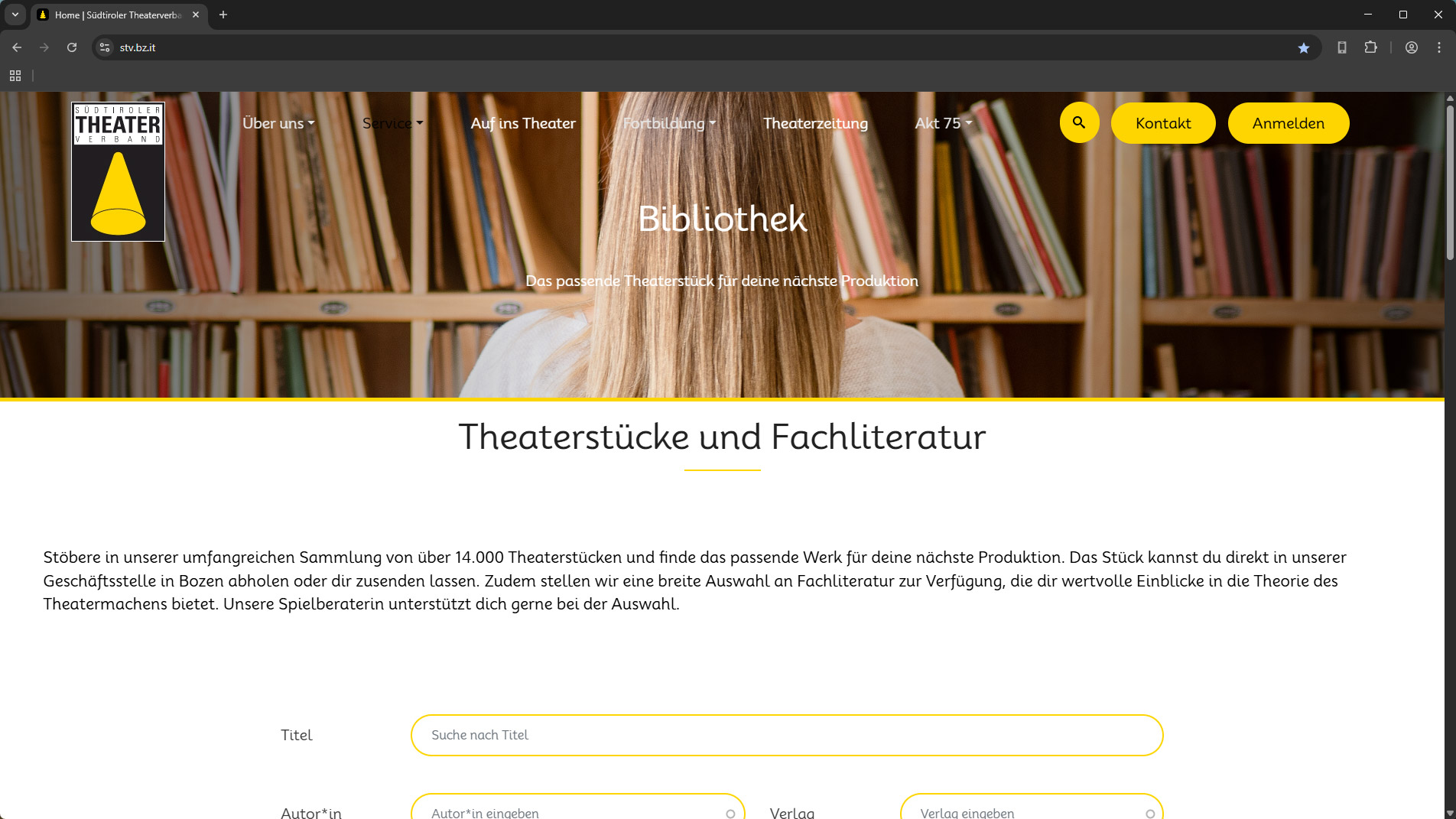 Web Teatro in Alto Adige Südtiroler Theaterverband Sito web per il Südtiroler Theaterverband (STV) Prestazioni Pianificazione, design e realizzazione di un sito web responsivo con CMS, hosting e supporto. stv.bz.it